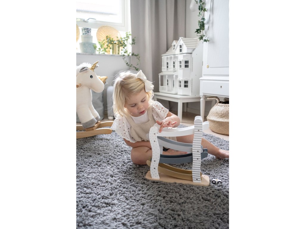 Kreatívna a zábavná pretekárska dráha pre malé deti. Stimuluje a podporuje rozvoj jemnej motoriky. Súťažte so svojimi priateľmi a zistite, ktoré auto ide dole najrýchlejšie. Ocenia všetky malí pretekári. Trať má 4 sprievodné autá v rôznych odtieňoch a farbách.