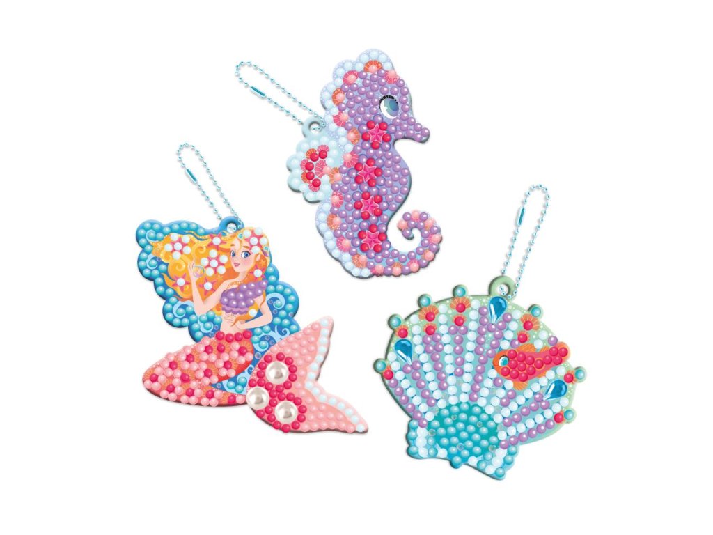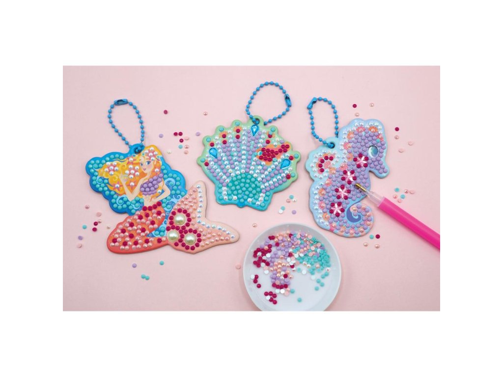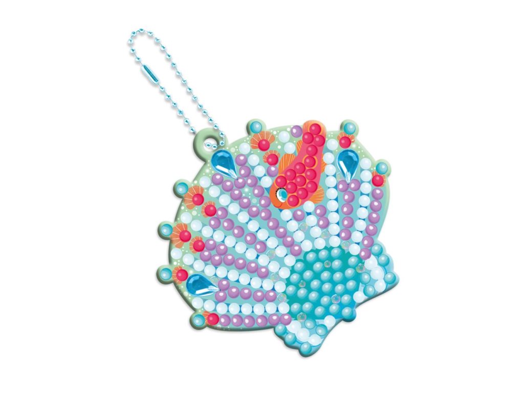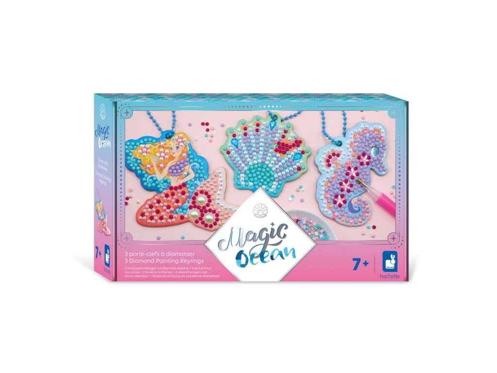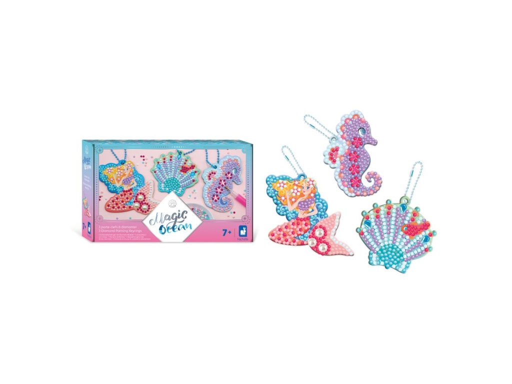 Ozdob kľúče, ktoré otvárajú dvere škrupinovej jaskyne! S touto kreatívnou súpravou si deti vo veku 7 a viac rokov ozdobia 3 prívesky na kľúče s mini kamienkami na tému morských panien. Kreatívna aktivita, ktorá samozrejme stimuluje trpezlivosť, presnosť a kreativitu! Morské panny milujú všetko, čo sa blyští: koraly, perly, odrazy vĺn... A drahé kamene! To je dôvod, prečo sú naše krásne kľúčenky brúsené diamantom. Dodajú vášmu každodennému životu, vašej súprave kľúčov alebo taške nádych kúzla! Na tento účel kreatívna krabička obsahuje: 3 samolepiace krúžky na kľúče, 3 retiazky, 10 kamienkov, 700 mini kamienkov, 1 stylus, 1 štvorček vosku a 1 pohár. Pokyny a šablóny sú k dispozícii pre deti, aby vyjadrili svoju kreativitu a nasledovali kroky krok za krokom, sú vytlačené vo vnútri krabice. Táto tvorivá dielňa je skvelým tipom na darček k narodeninám. Ponorte sa do sveta kolekcie "Magic Ocean", kreatívnych voľnočasových súprav pre deti na tému hlbokého mora, na kreatívne popoludnia uspávané zvukom vĺn!