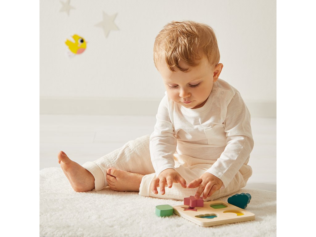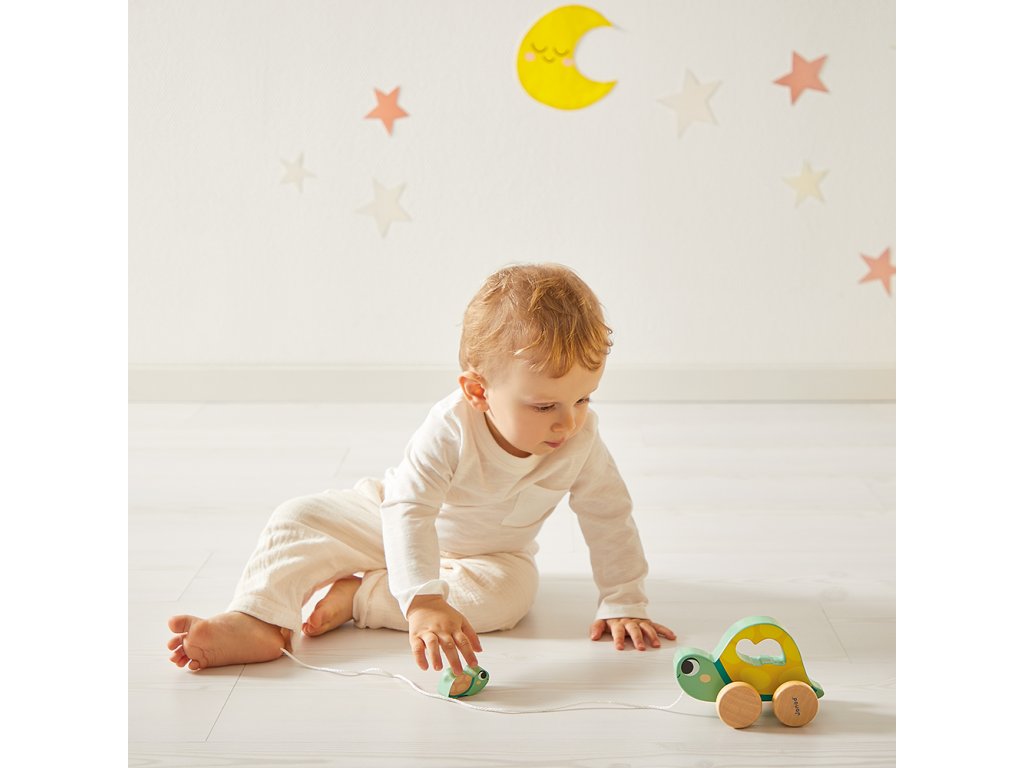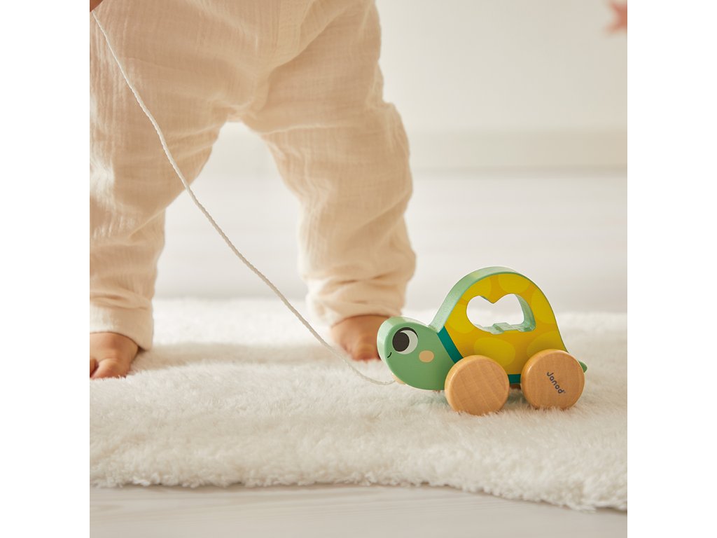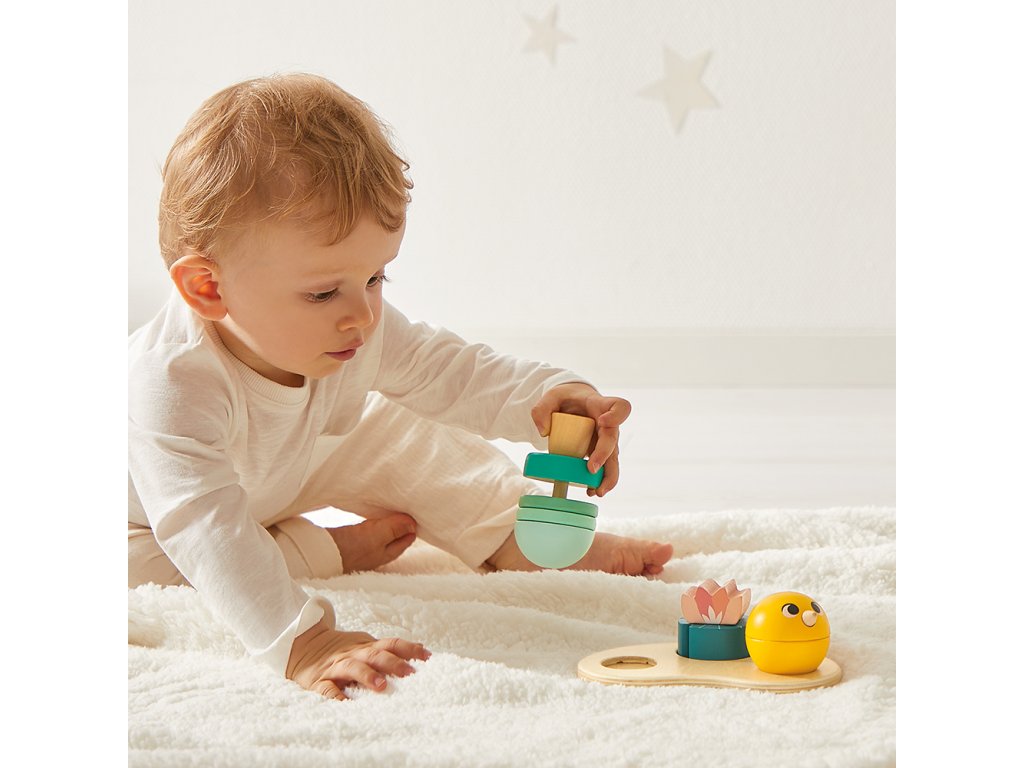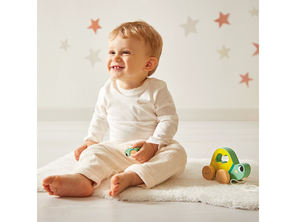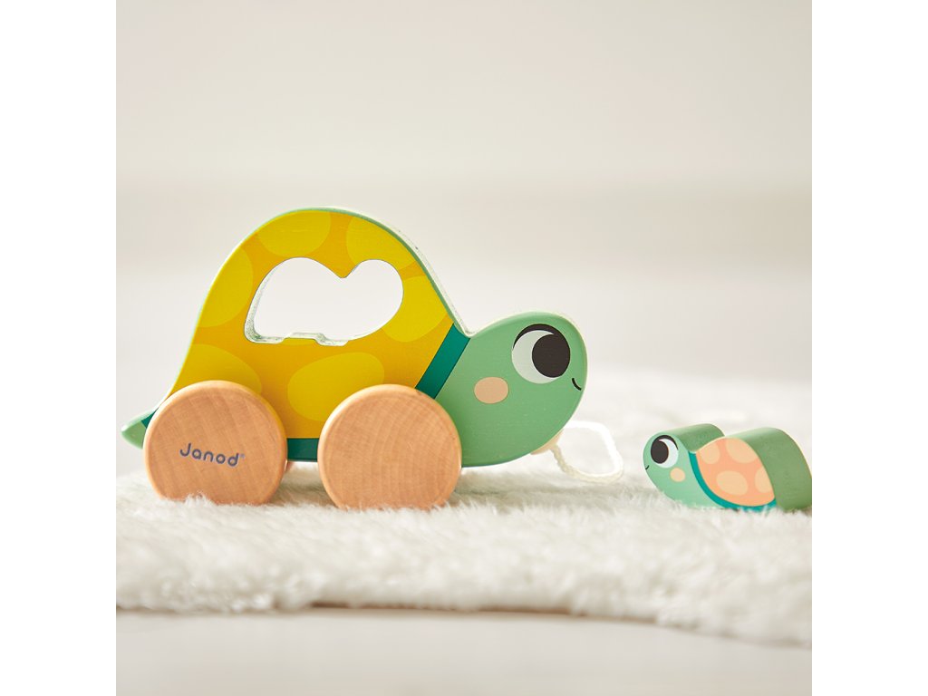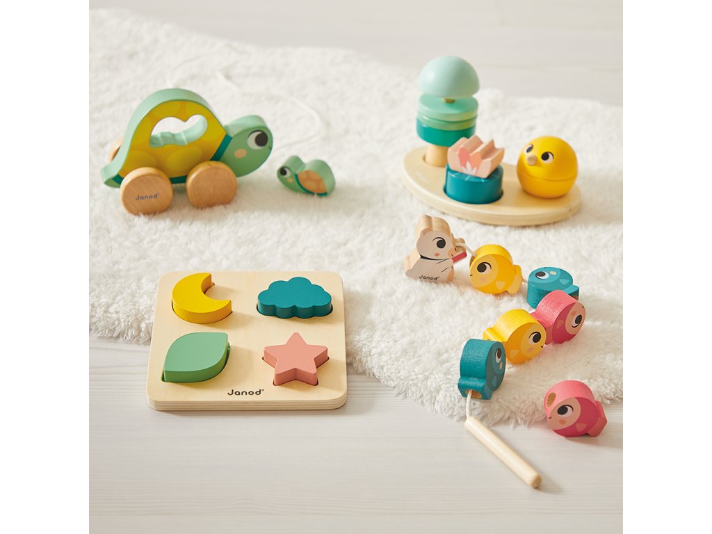 Obsahuje: ťahaciu korytnačku mamičku s malým mláďatkom na vkladanie, 6 navliekacích drevených dielikov v tvare rybky, hračku na nastokávanie a 4-dielne veľké vkladacie puzzle.