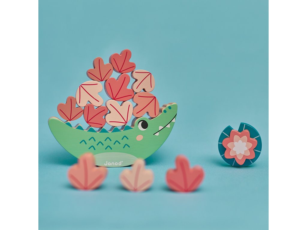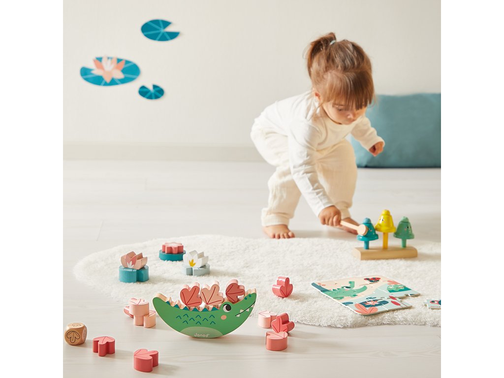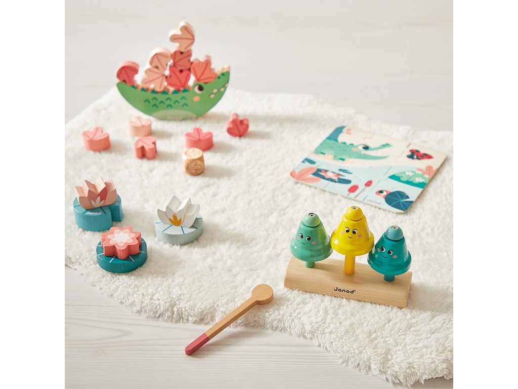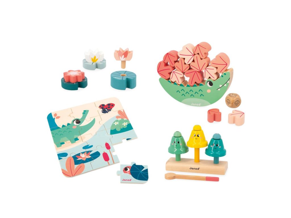 Obsahuje: krokodíla hračku na rovnováhu, 3 skrutkovacie lekná, zvukovú hračku zvončeky s paličkou a 12-dielne drevené puzzle.