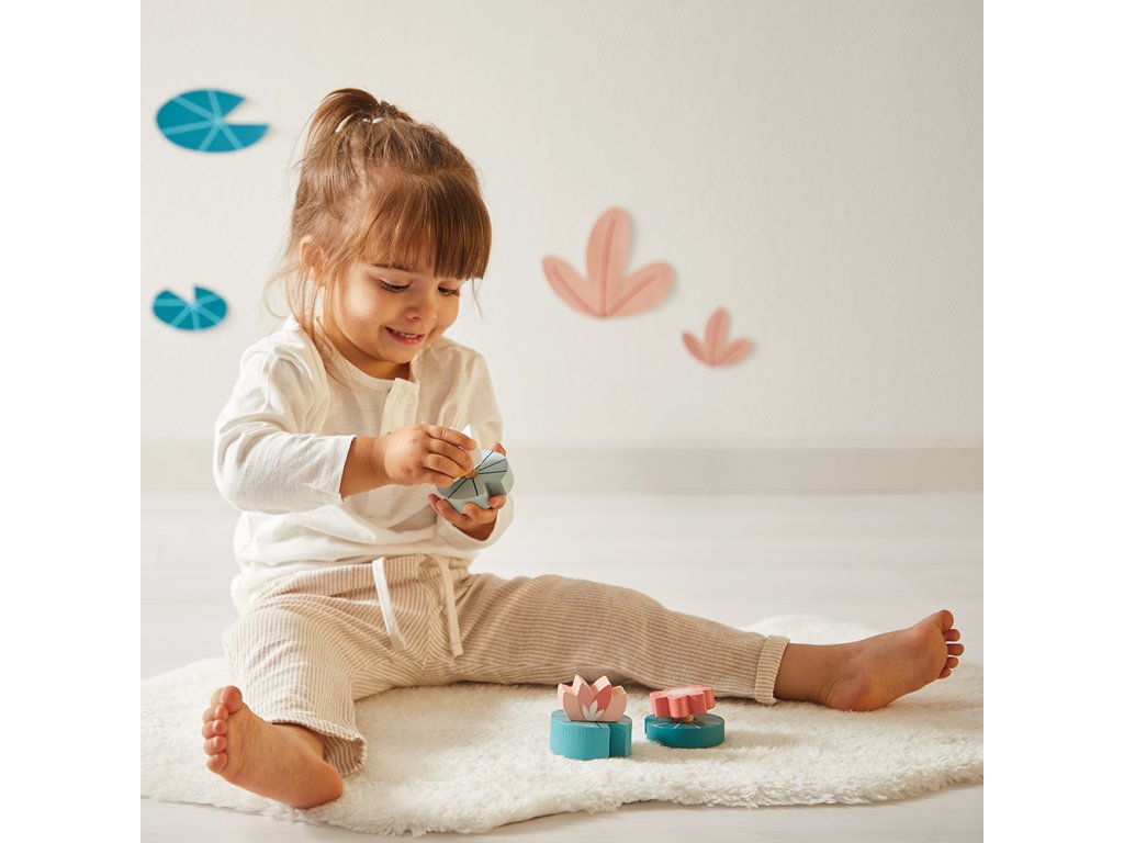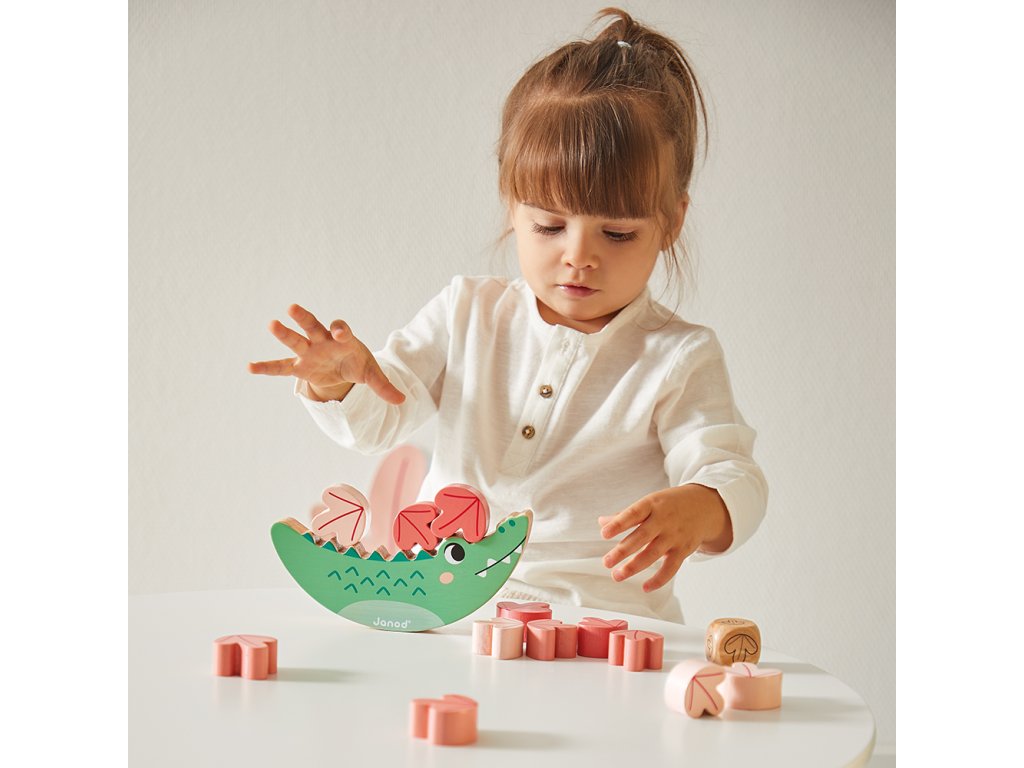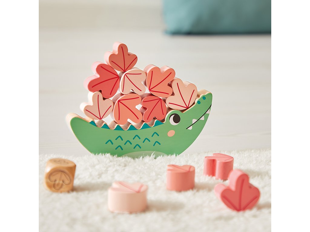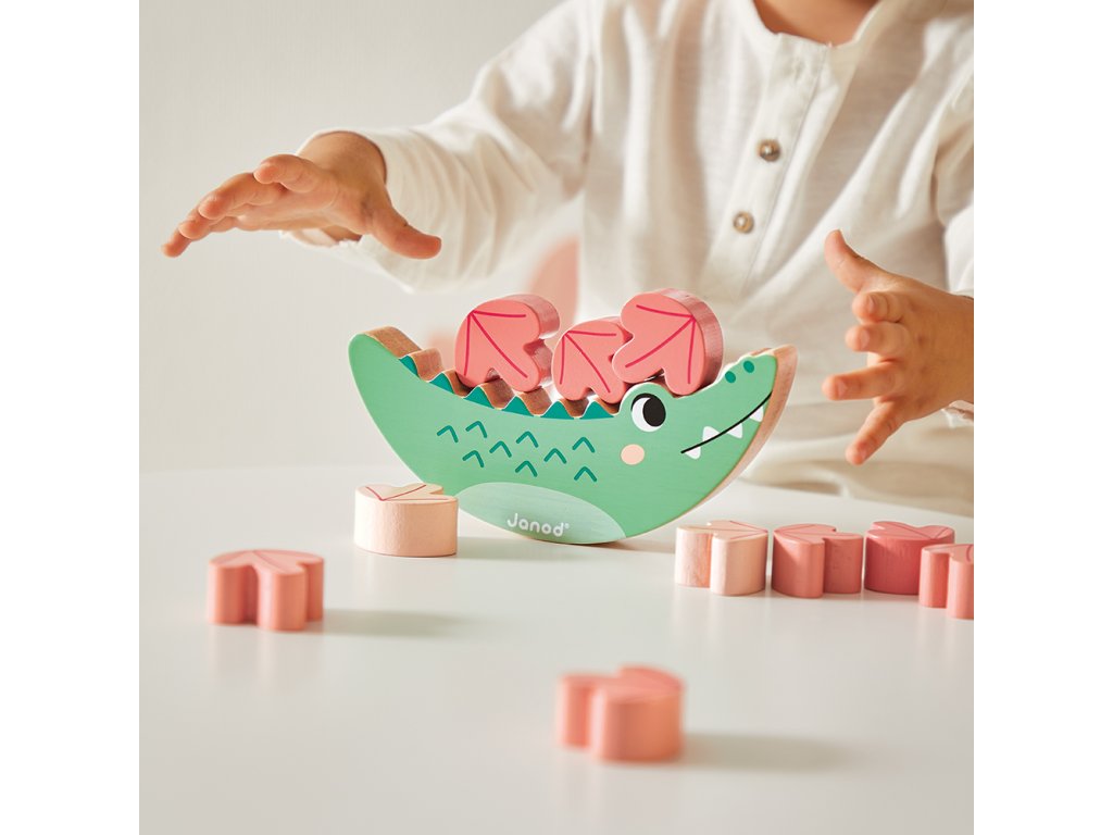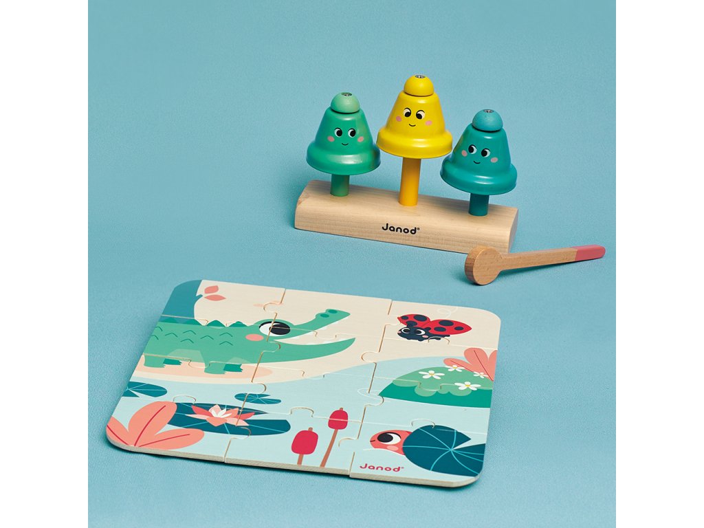 Obsahuje: krokodíla hračku na rovnováhu, 3 skrutkovacie lekná, zvukovú hračku zvončeky s paličkou a 12-dielne drevené puzzle.