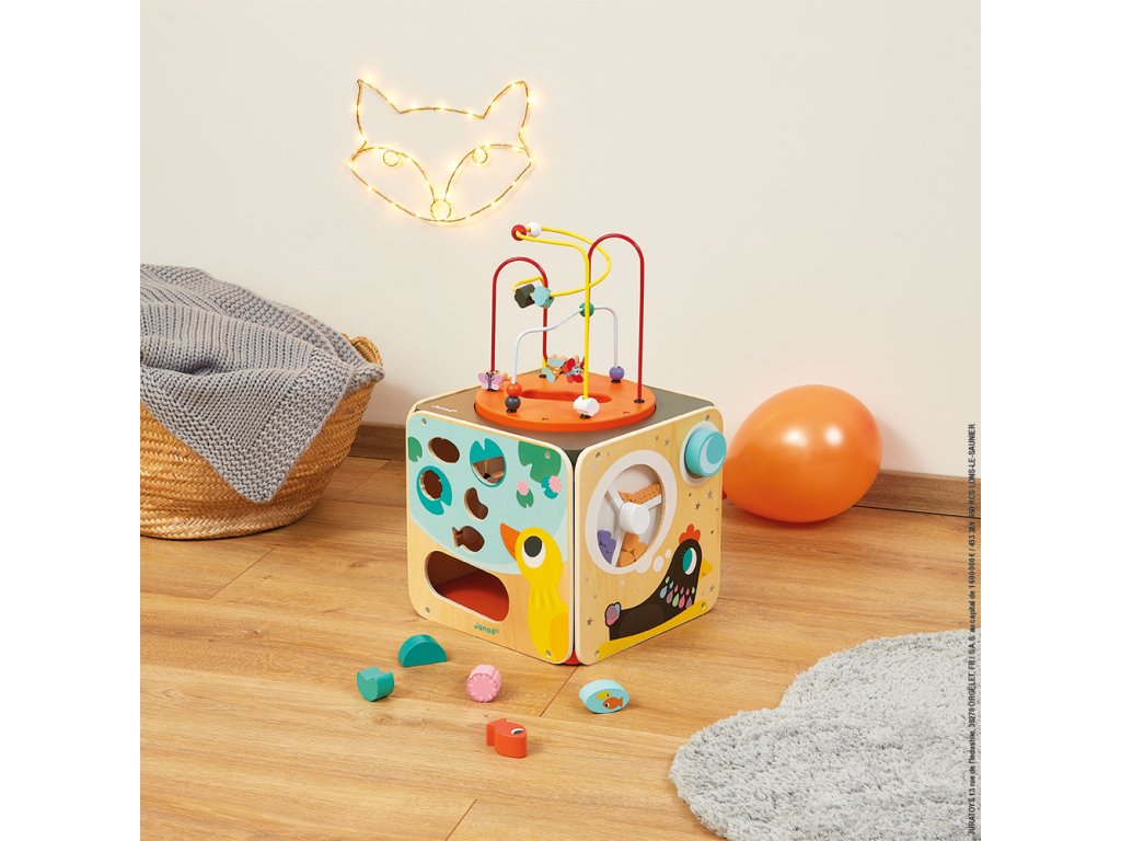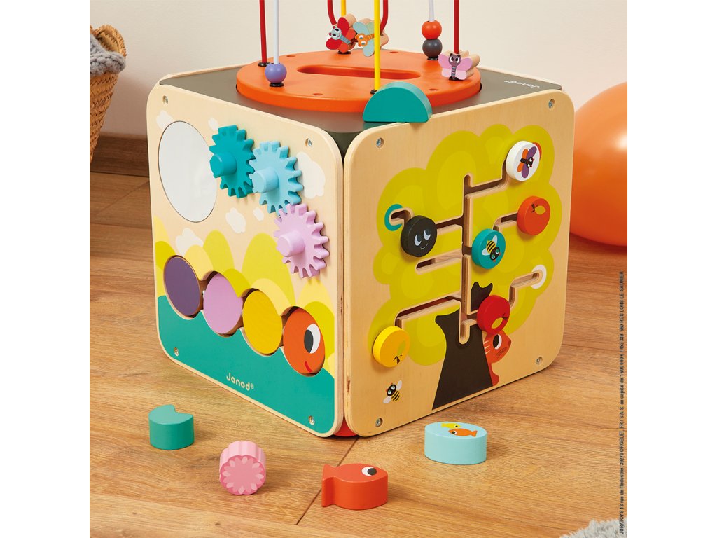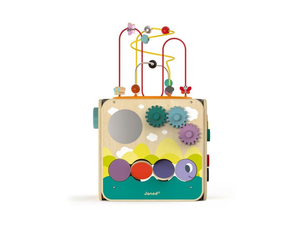 Pestrofarebná drevená multifunkčná kocka MultiActivity Janod so slučkovacím labyrintom a ďalších 8 vzdelávacích aktivít k tomu.