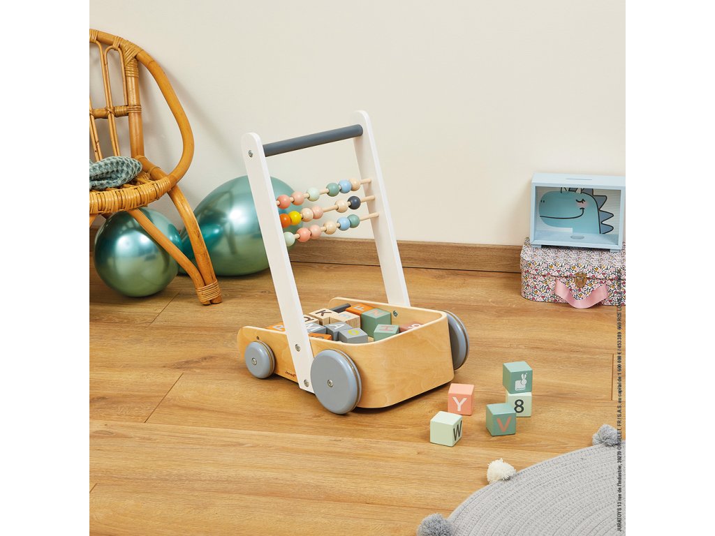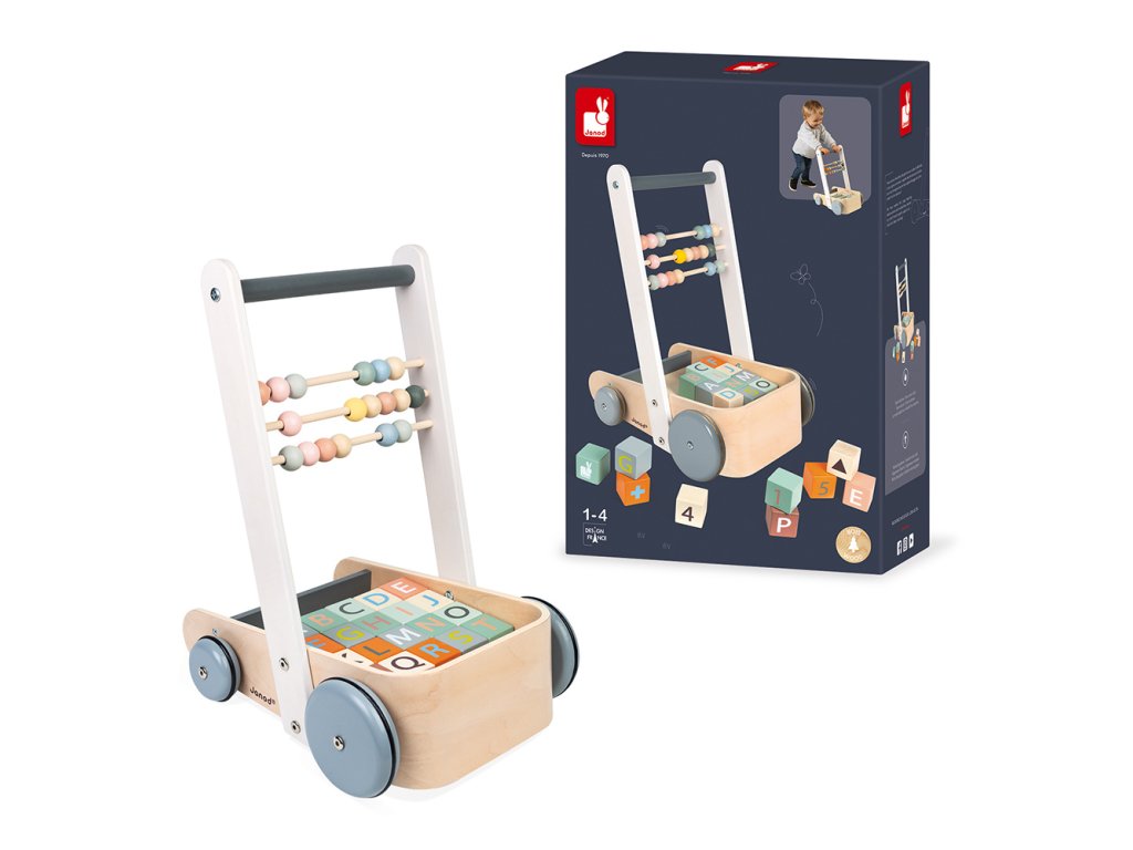 Drevené chodítko a vozík s počítadlom a kockami Janod séria Sweet Cocoon.
