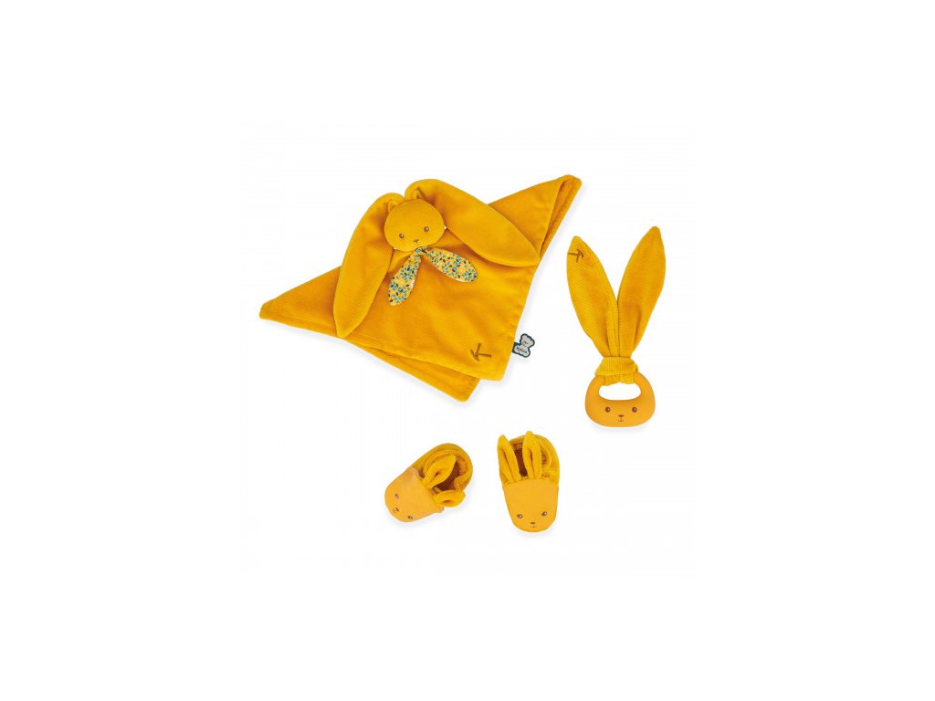 Kaloo Lapinoo Darčeková sada pre bábätko s hrkálkou hryzátkom a capačkami okrová