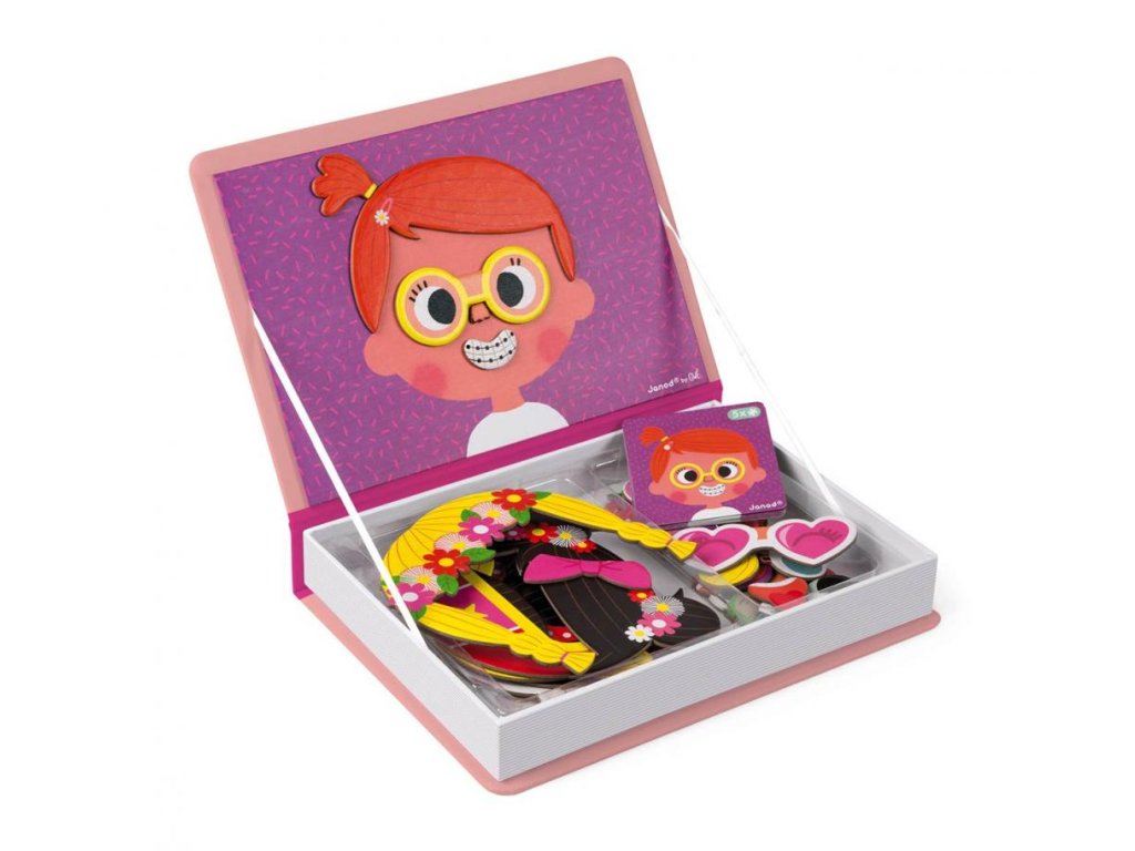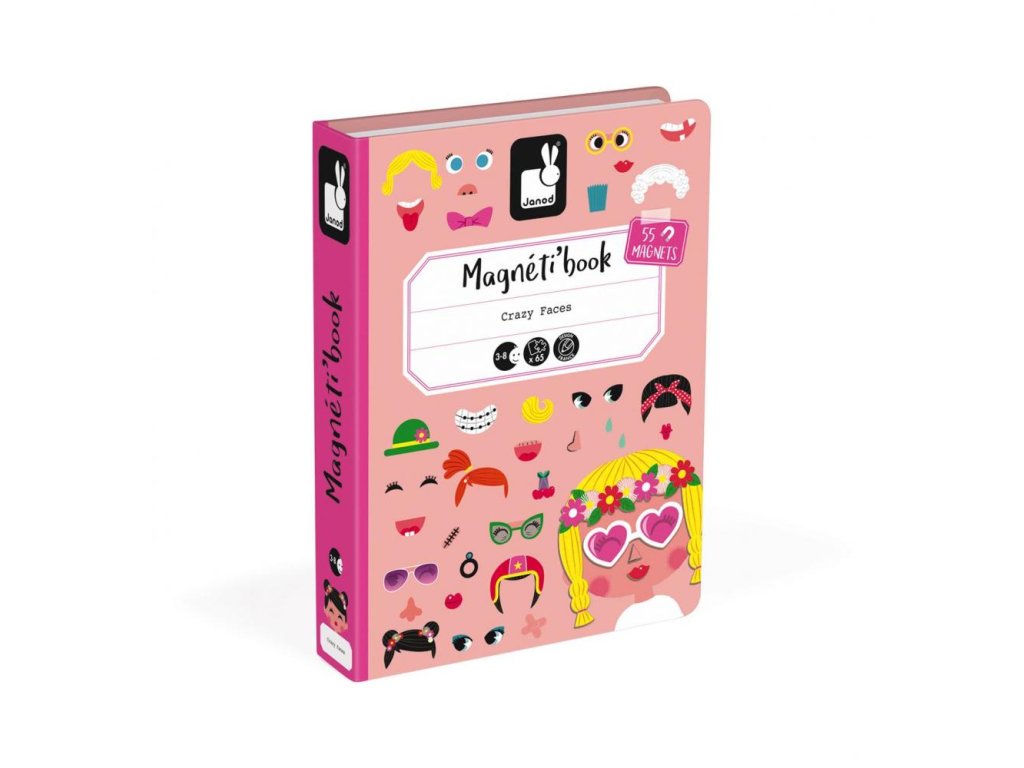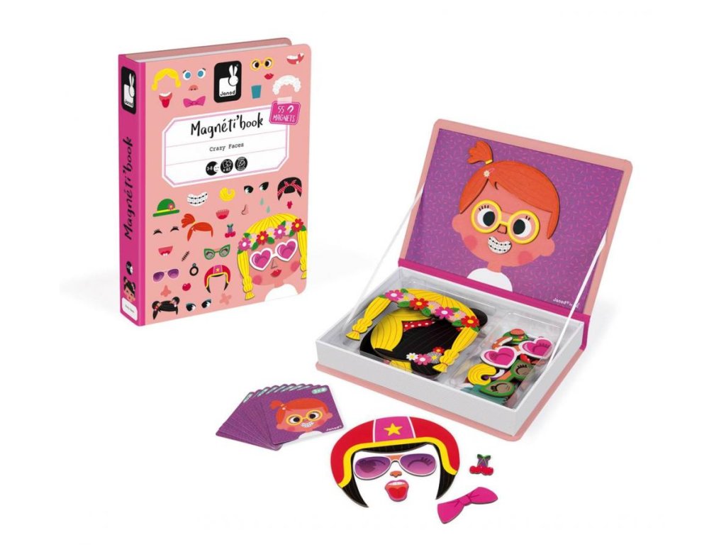 Kniha Magneti'Book Crazy Face je magnetická hračka z dielne výrobcu Janod. Je to krásna hračka vhodná pre deti od 3 do 8 rokov. Magnetická skladačka v tvare knihy má pestrofarebný motív, ktorý detí zaujme. Deti skladajú veselé obrázky pomocou dielikov, pomôcť si môžu predlohami. Dieťa vyberá rôzne oči, okuliare, vlasy a doplnky pre veselého klauna na knihe, najskôr podľa predlohy a potom podľa vlastnej fantázie.