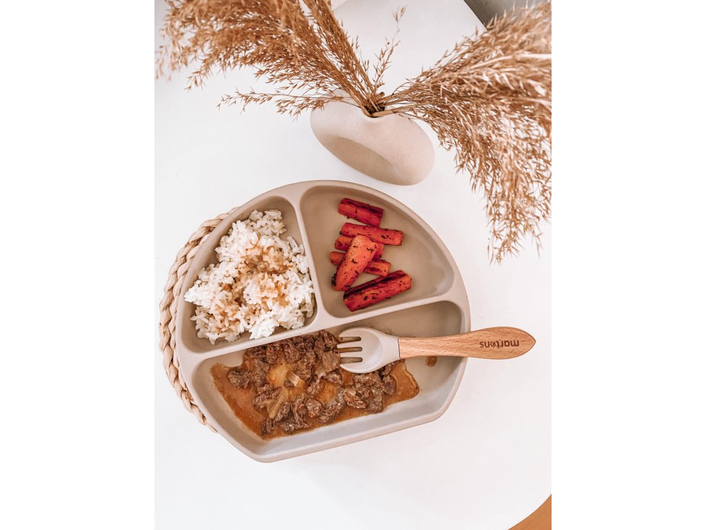 Tanieriky: Tvar tanierika Martons s prísavkou bol konštruovaný tak, aby sa príslušnou lyžičkou a vidličkou vedeli deti dostať do každého rohu tanierka. Vďaka predeleniu na viac časti zostáva hlavné jedlo od ostatných príloh, ovocí či desertu predelené a deťom môžťe dať do rôznych častí rôzne jedlá, môžu sa tak zoznamovať s chuťou jednotlivých jedál. Protišmyková prísavka na spodnej časti slúži proti prevráteniu misky alebo rozliatiu jedla. Postup: Nachystajte jedlo to Martons silikonového tanierka a položte ich na stôl a trocha potlačte iba sa s prísavkou prilepilo ko stolu.
