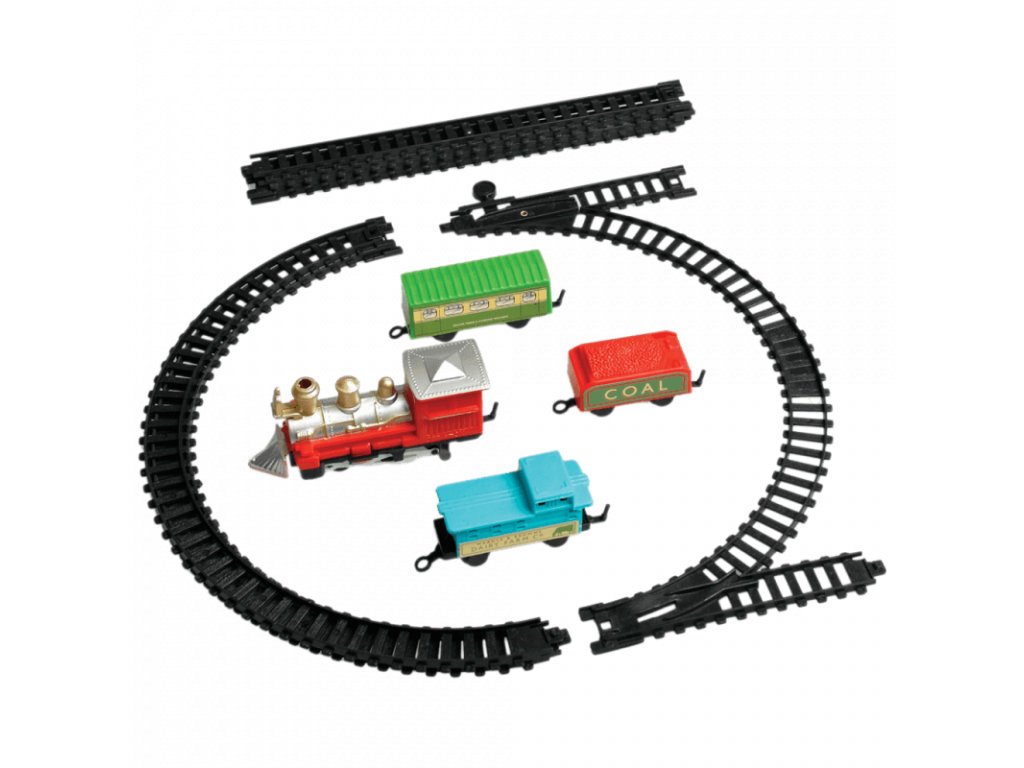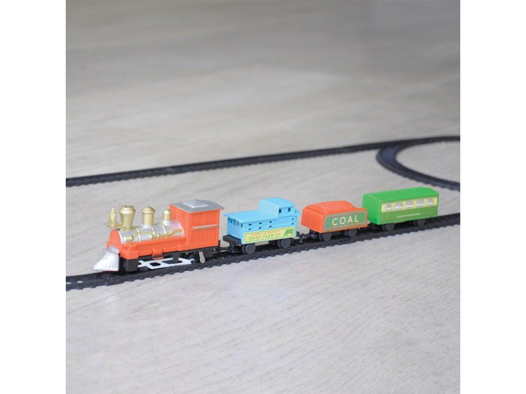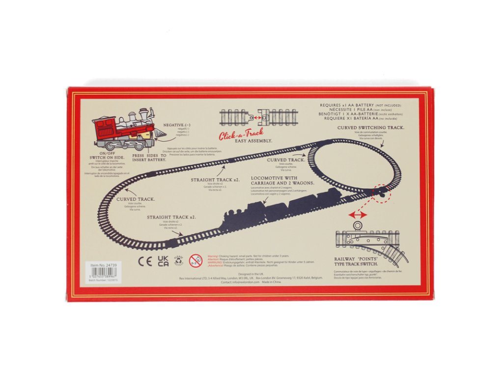 1 × Červená lokomotíva na batérie s vypínačom na boku, rozmery 10 × 2,5 × 4 cm (vyžaduje 1 × AA batériu, ktorá nie je súčasťou balenia)